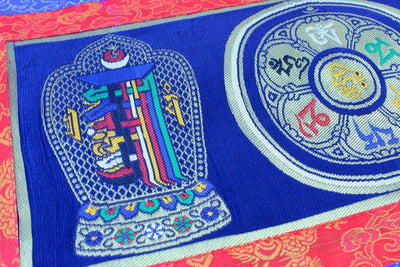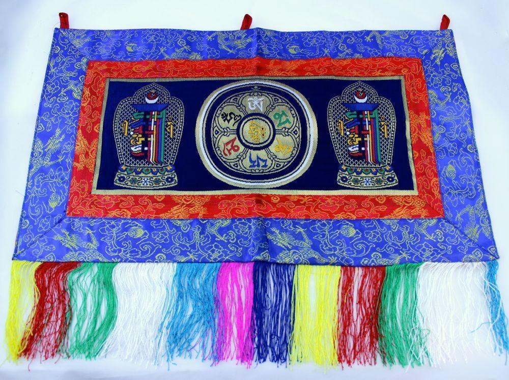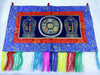 Este exquisito colgante de pared está bordado a mano y es perfecto para una sala de santuario o un espacio sagrado. Los colores azules brillantes y atrevidos dominan este tapiz de pared único, junto con borlas multicolores que cuelgan de la parte inferior.