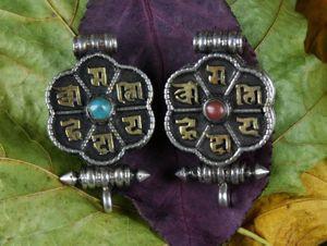 Este gau hecho a mano de 1 y 1/4 de pulgada incluye una pequeña imagen de HH, el Dalai Lama y un pequeño fragmento de un pañuelo de saludo tibetano. Los tibetanos usan estos amuletos de su fe y los utilizan como un pequeño altar cuando viajan. La inscripción es el mantra de la Compasión: Om Mani Padme Hum. Coral de piedra central solo ahora disponible.