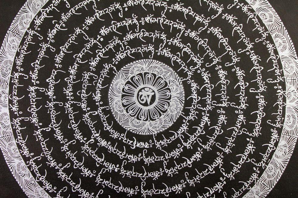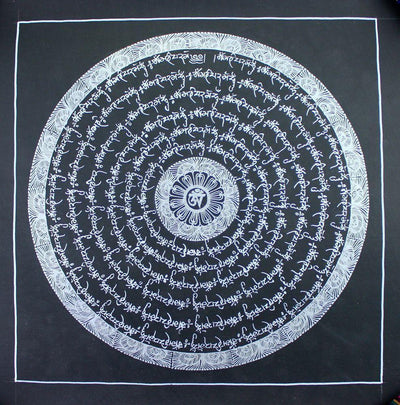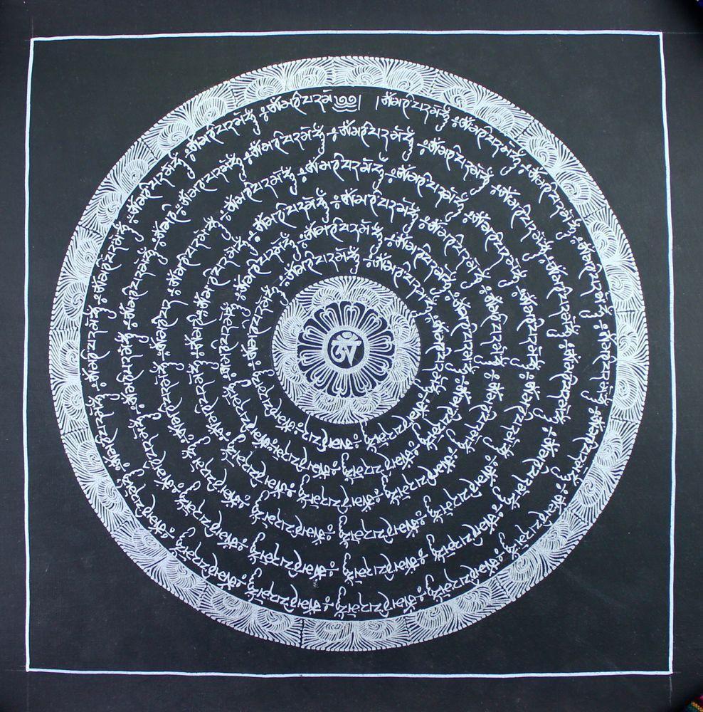 Un hermoso mandla Om Mani pintado en plata sobre lienzo hecho a mano en Katmandú, Nepal, a un precio excelente.