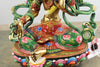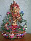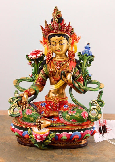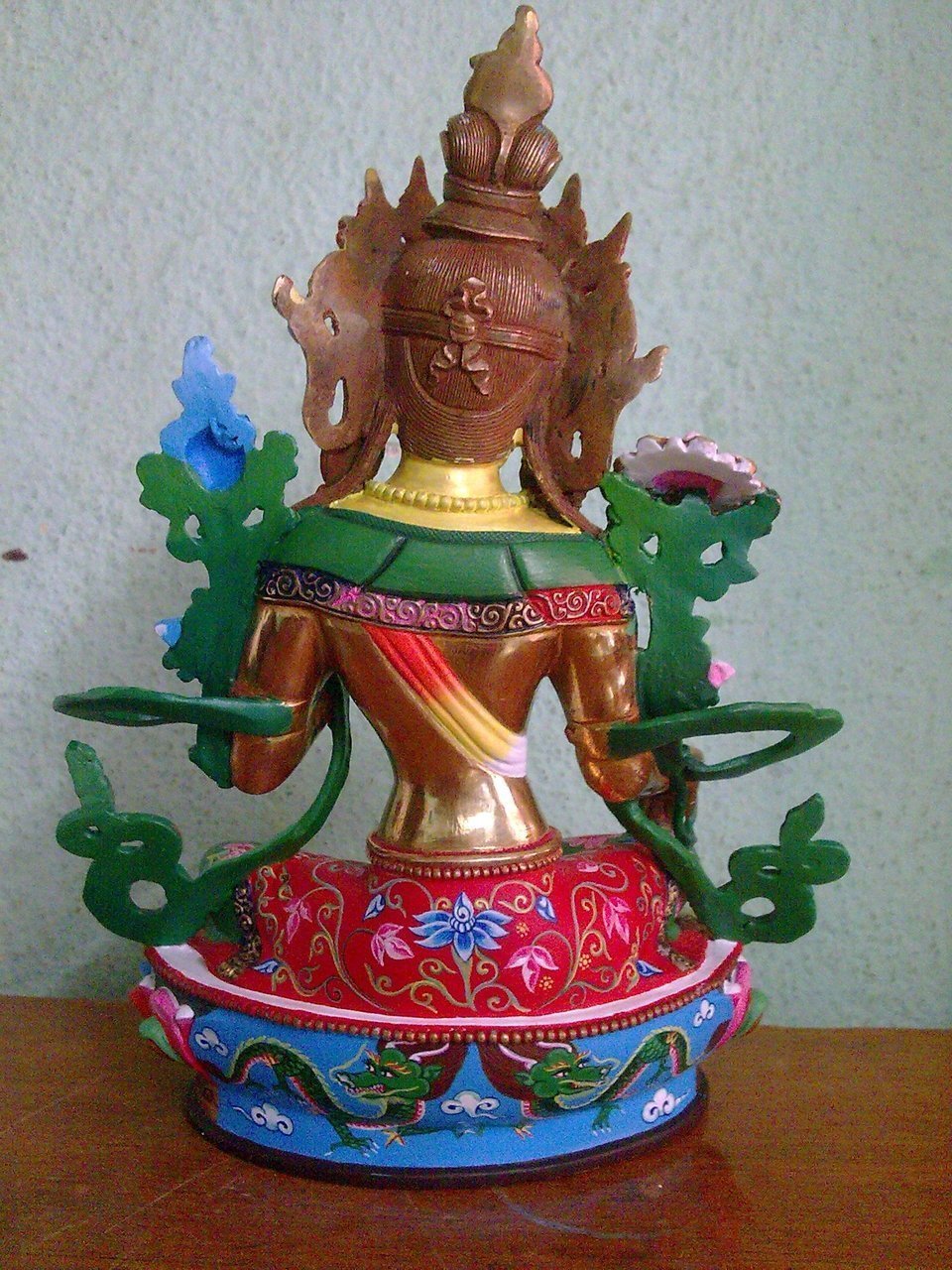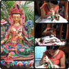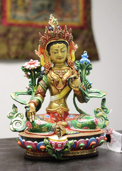 Nuestros creadores de estatuas en Katmandú están haciendo un trabajo increíble recientemente: esta Tara Verde está tallada completamente a mano y luego fundida utilizando el método de cera perdida. Más de 8 artistas trabajan en cada una de estas estatuas, tallando, haciendo moldes de cera, vertiendo bronce caliente, pintando las caras y los ojos dorados y pintándolos a mano. Meena Shakya, una maestra artesana, hizo todo el trabajo final; le lleva meses y, a veces, años completar una estatua con detalles tan intrincados. Observe las extraordinarias imágenes pintadas en el regazo y en la espalda de Tara.