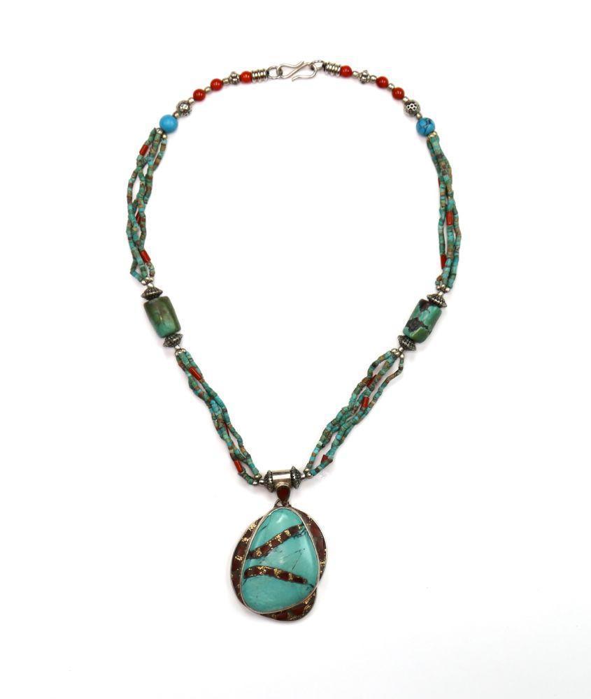 Piedras de coral y turquesa engastadas a mano en monturas tibetanas plateadas.