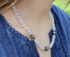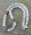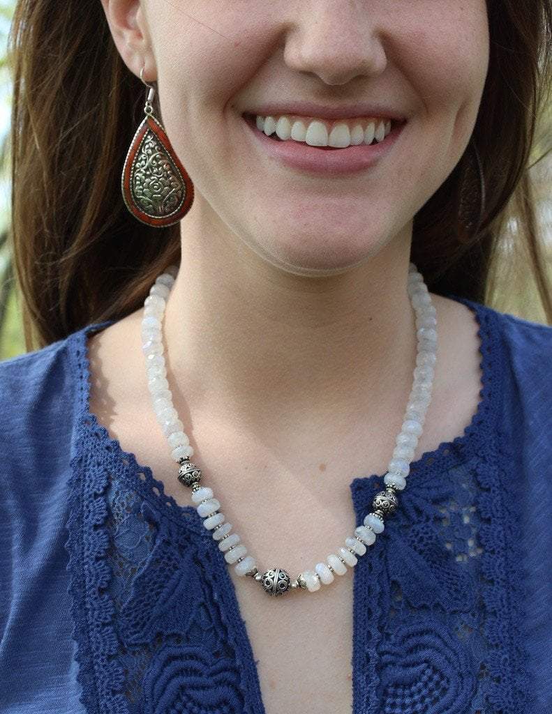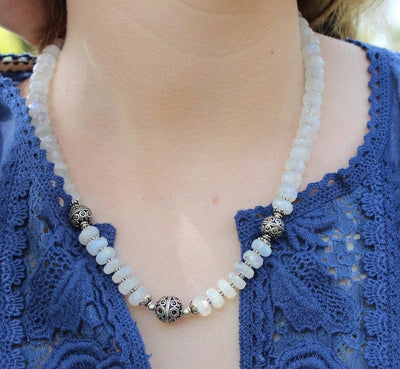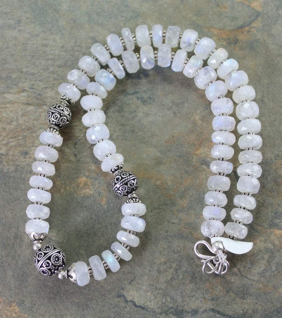 Un extraordinario collar de rondelle (pequeño disco de vidrio) facetado de "piedra lunar" de opalita hecho a mano con espaciadores de plata de primera ley y cuentas focales. ¡Esta pieza es única y es más que impresionante!