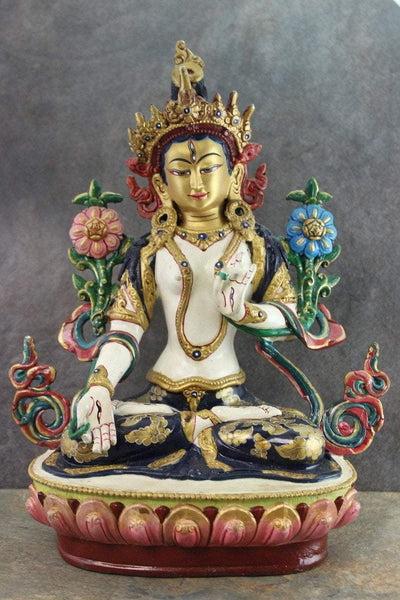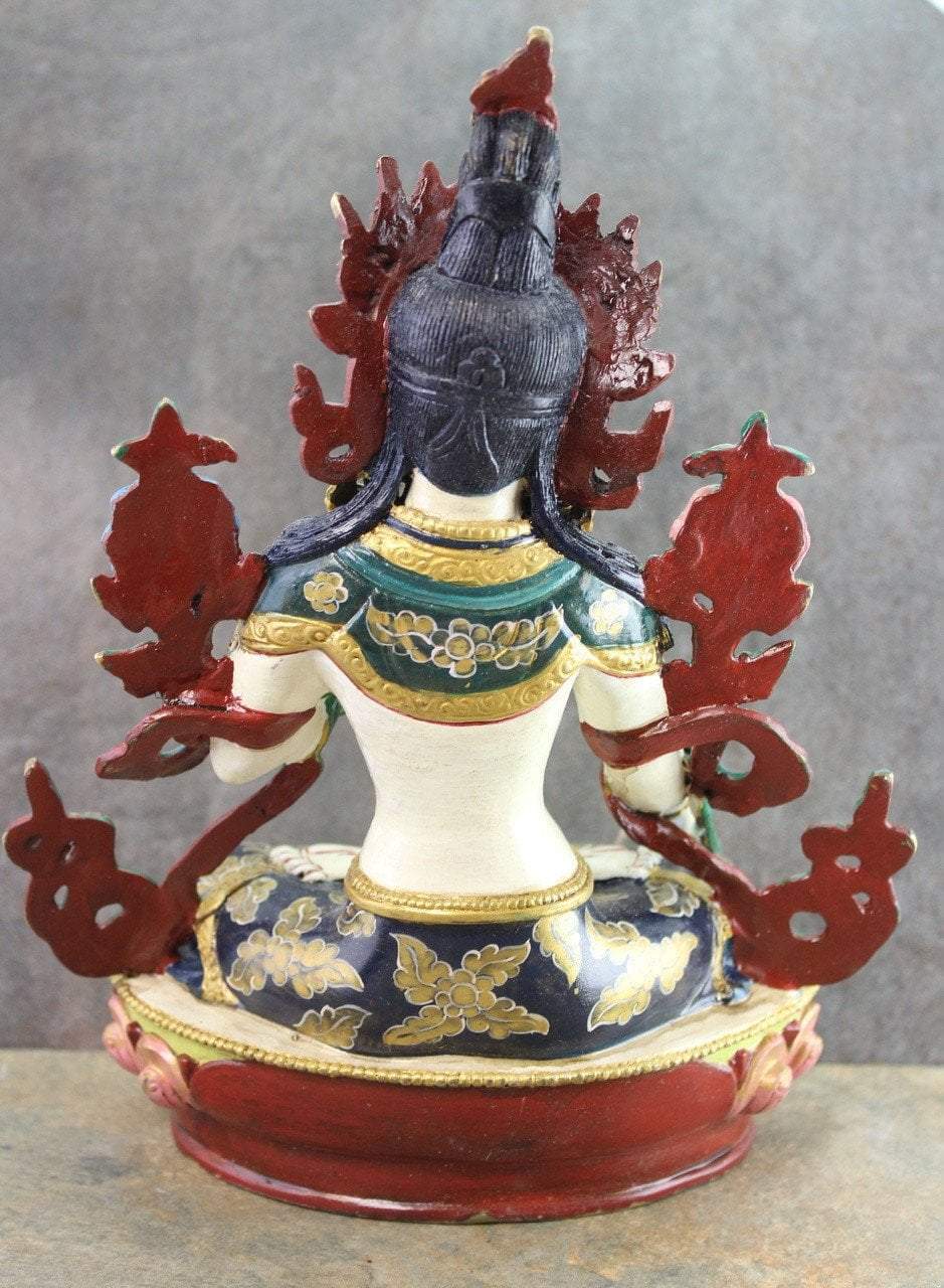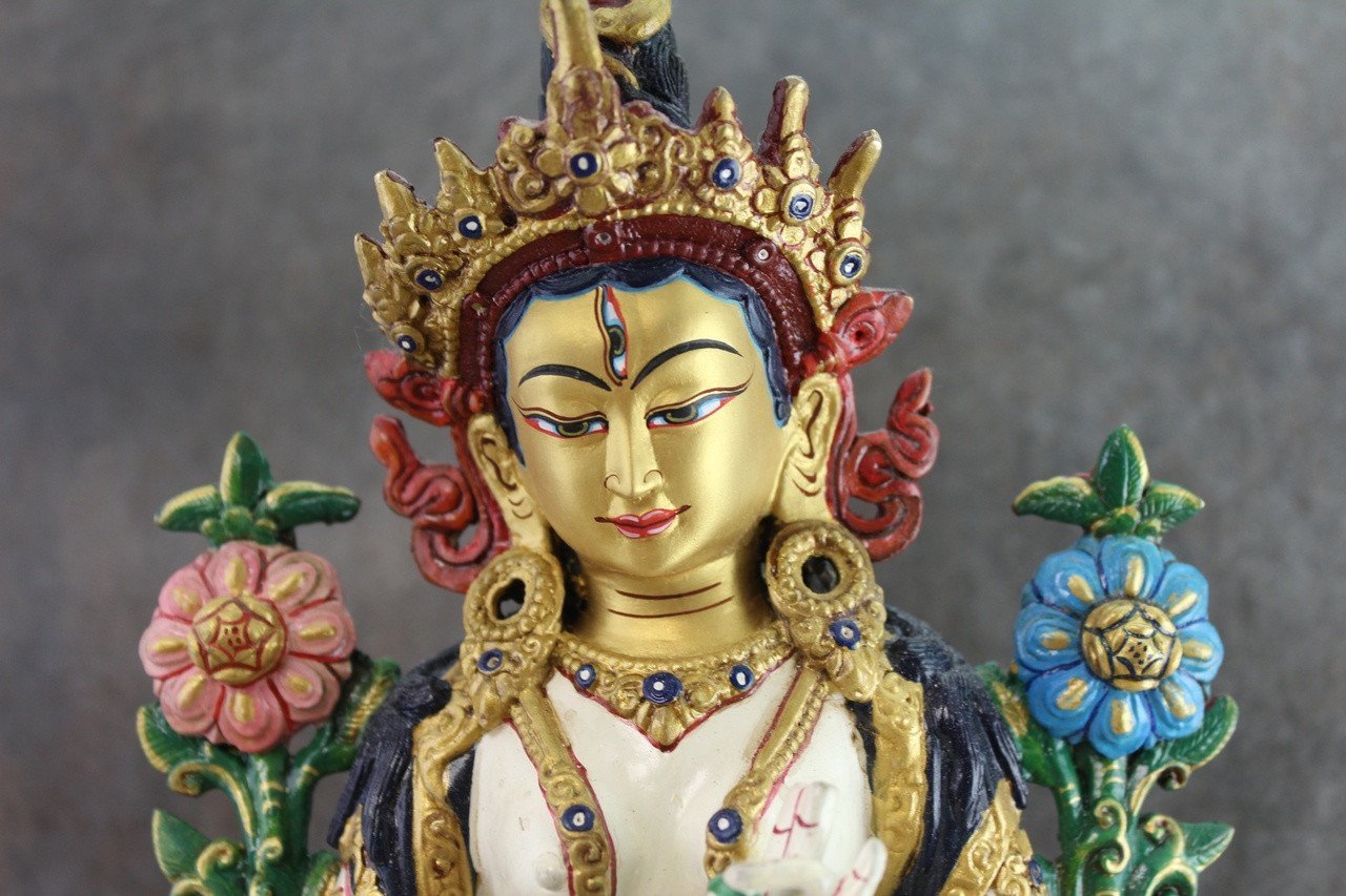 Nuestros creadores de estatuas en Katmandú están haciendo un trabajo increíble recientemente: esta Tara Blanca está tallada completamente a mano y luego fundida utilizando el método de cera perdida. Más de 8 artistas trabajan en cada una de estas estatuas, tallando, haciendo moldes de cera, vertiendo bronce caliente, pintando las caras y los ojos dorados y pintándolos a mano. Un maestro artesano hizo todo el trabajo de acabado y está intrincadamente jadeado en ambos lados.