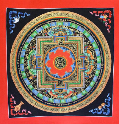Este thangka presenta un diseño de mandala muy colorido con un símbolo de concha en el centro. La naga/concha es uno de los ocho símbolos auspiciosos y representa la fama de las enseñanzas de Buda que se extiende en todas direcciones como el sonido de la trompeta de la caracola. Es un símbolo que proclama sin miedo la verdad del dharma.