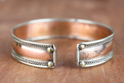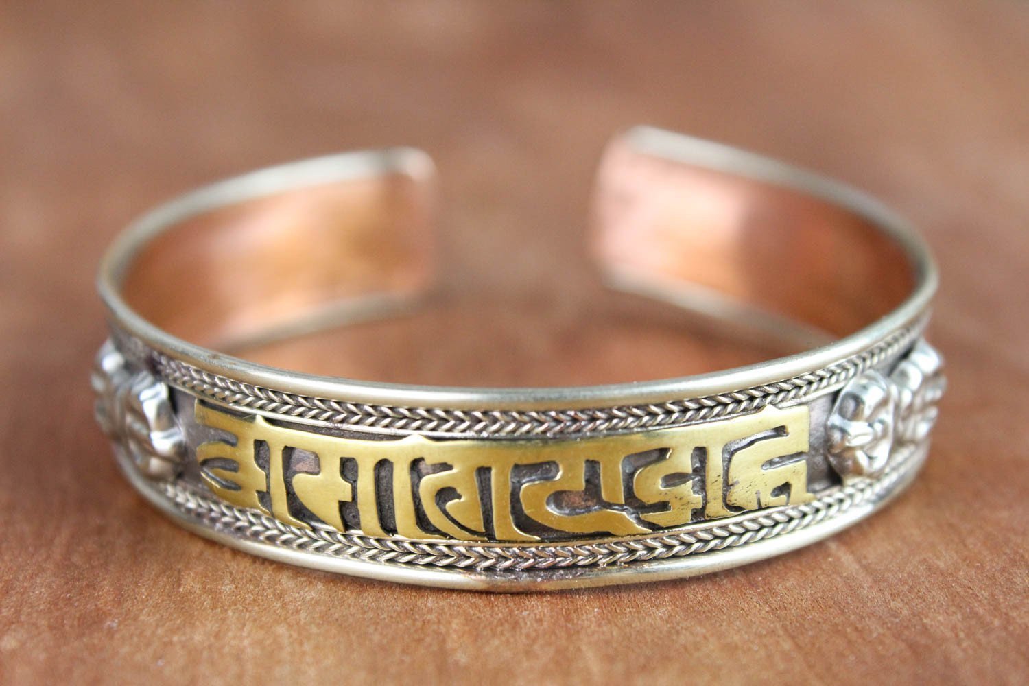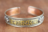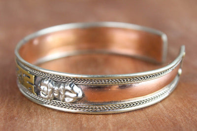 Esta pulsera totalmente ajustable de latón, cobre y metal blanco está fabricada en Nepal y presenta el mantra de la compasión, "om mani padme hum" en escritura sánscrita tradicional. El mantra invoca la poderosa atención benévola y las bendiciones de Chenrezig, la encarnación de la compasión. Esta pulsera también incluye hermosos detalles de cuerdas y detalles en dorje a ambos lados del mantra. Simbólicamente, un dorje representa el "rayo de la iluminación". Una vez "iluminado", el observador puede desapegarse de la importancia personal del dinero, el romance, la comida e incluso la vida misma.