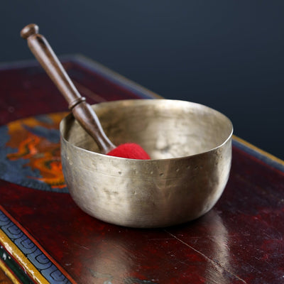 El cuenco suena en una nota Mi cuando se golpea con un mazo de lana. Esta nota resuena con el chakra del Plexo Solar. Situado en el centro del cuerpo, es el lugar donde se distribuye la energía física. Es el centro de las emociones no refinadas y del poder personal, y el centro que nos da la sensación de completa satisfacción y contentamiento.