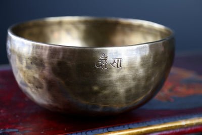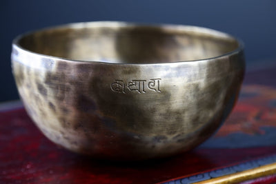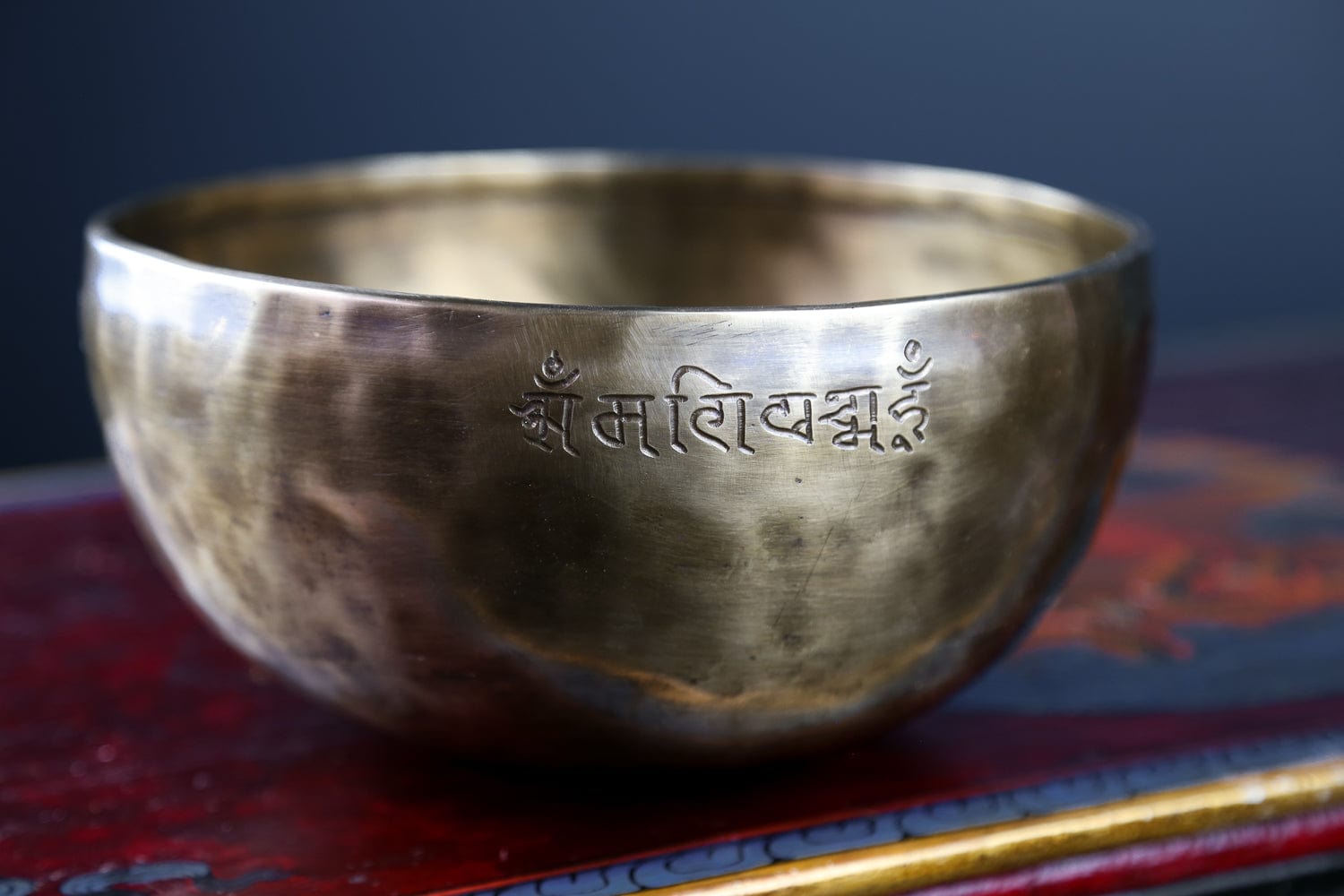 Cada cuenco presenta magníficos detalles tallados a mano, incluido un sello exclusivo del Cuenco Cantor de Luna Llena, una marca original del fabricante y el mantra de la compasión en escritura tibetana. El mantra invoca la poderosa atención benévola y las bendiciones de Chenrezig, la encarnación de la compasión. El sello Full Moon Singing Bowl también se conoce como símbolo de longevidad y felicidad.
