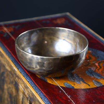 Cada cuenco presenta magníficos detalles tallados a mano, incluido un sello exclusivo del Cuenco Cantor de Luna Llena, una marca original del fabricante y el mantra de la compasión en escritura tibetana. El mantra invoca la poderosa atención benévola y las bendiciones de Chenrezig, la encarnación de la compasión. El sello Full Moon Singing Bowl también se conoce como símbolo de longevidad y felicidad.