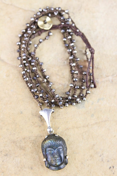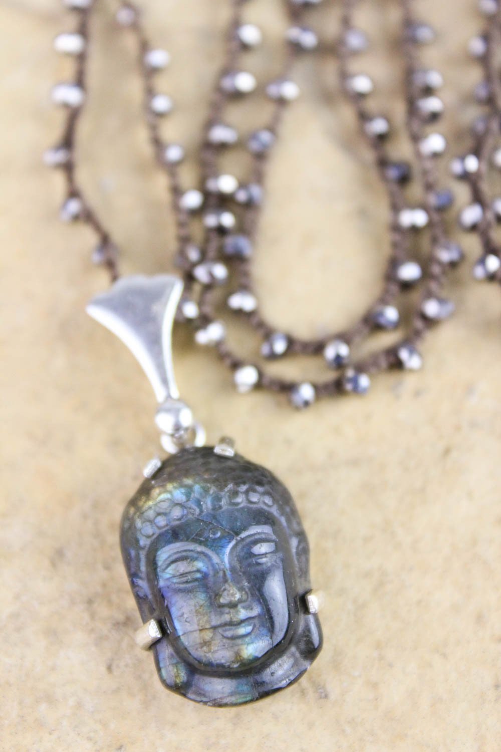 Buda de labradorita tallado a mano en un intrincado engaste de plata esterlina con una hermosa fianza, ensartada en un cordón tejido marrón con cuentas facetadas. Cada colgante es único y revela su particular iridiscencia.