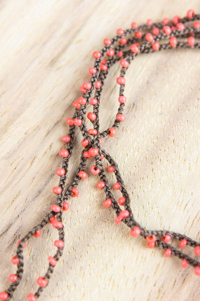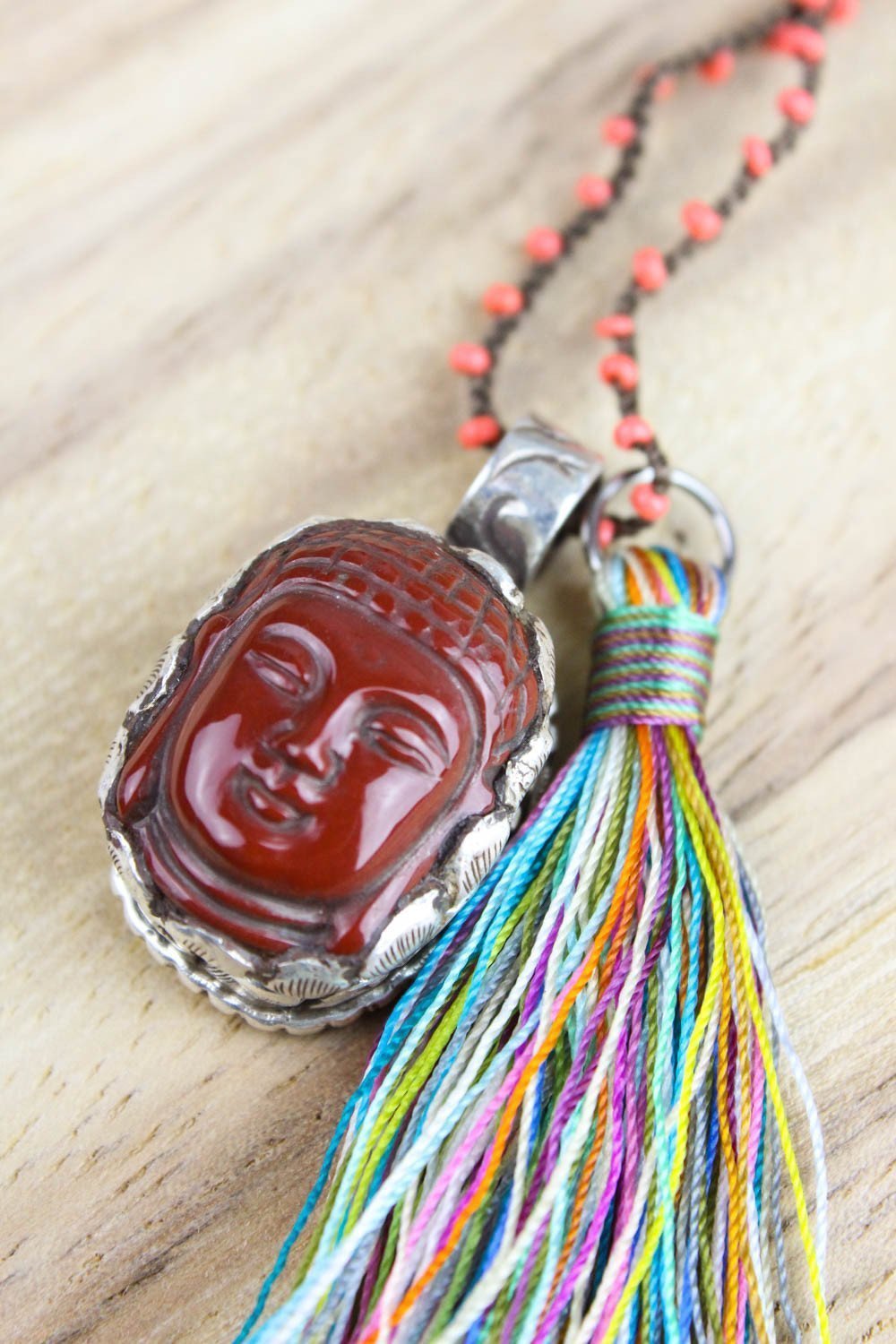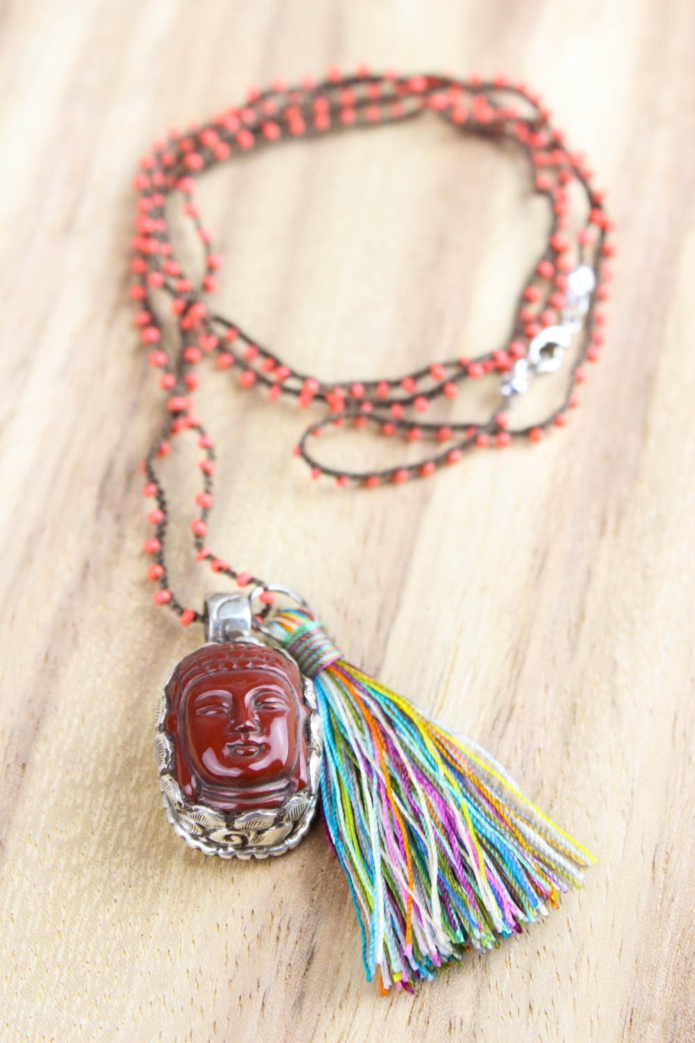 Nuestro nuevo y vibrante collar presenta un colgante de Buda de cornalina tallado a mano en latón plateado junto con una borla de arcoíris y está ensartado a mano en un hermoso cordón de cuentas de color naranja.