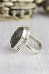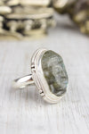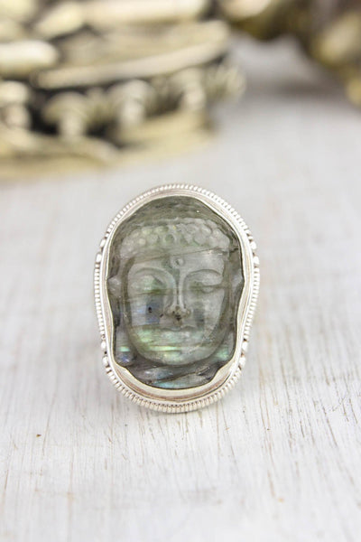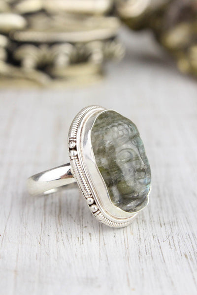 Distintivo anillo con cabeza de Buda de labradorita con serena expresión meditativa engastado en plata de ley. Un intrincado trabajo de cuerda hecho a mano decora el costado del entorno.