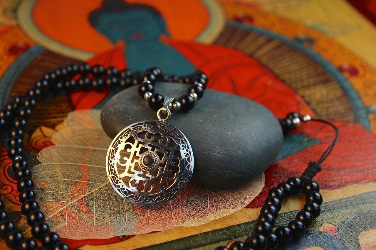 Tamaño: Aproximadamente 28 pulgadas alrededor cuando está abierto y aproximadamente 25 pulgadas cuando está cerrado. El colgante de plata mide aproximadamente 1 1/2 pulgadas de largo (incluyendo la fianza). Las cuentas de ónix negro miden aproximadamente 5 mm.