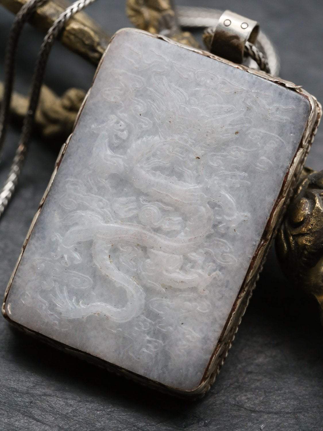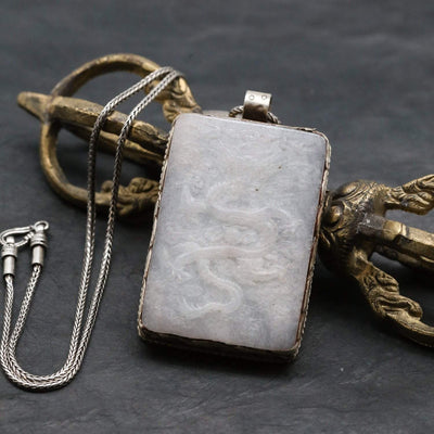 Este hermoso collar con colgante presenta un diseño de dragón intrincadamente tallado en un colgante de piedras preciosas de cristal de cuarzo. El engarce de plata esterlina incluye hermosos detalles de cuerda junto con un diseño de dragón tallado en la parte posterior. Cuelga de una cadena tejida de plata de primera ley.
