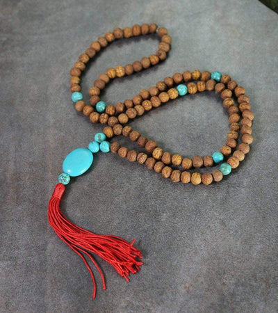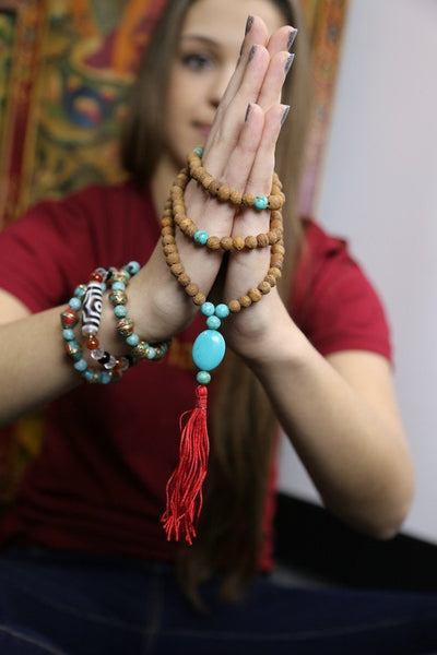 Uno de nuestros tradicionales malas tibetanos de cuentas raktu. Cuenta con 8 espaciadores de color turquesa y una cuenta grande de gurú de color turquesa para contar fácilmente. Acentuado con una borla roja.