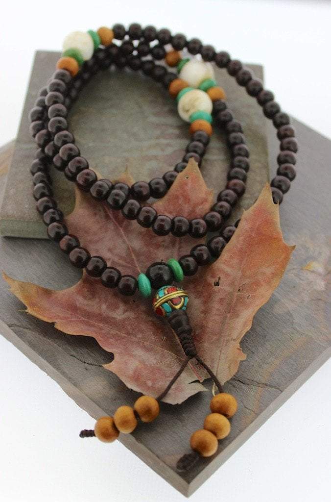 ¡Uno de nuestros nuevos diseños favoritos! Hermosas cuentas de madera oscura con espaciadores de concha de sándalo, turquesa y naga. También cuenta con una cuenta de gurú con incrustaciones vintage.