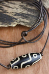 Cada collar, único en su tipo, está colgado en DharmaShop con cuentas Dzi recolectadas en los últimos 17 años en Katmandú, Nepal. Se dice que la cuenta Dzi de nueve ojos promueve la riqueza, la buena salud, el éxito, la compasión y la gloria.