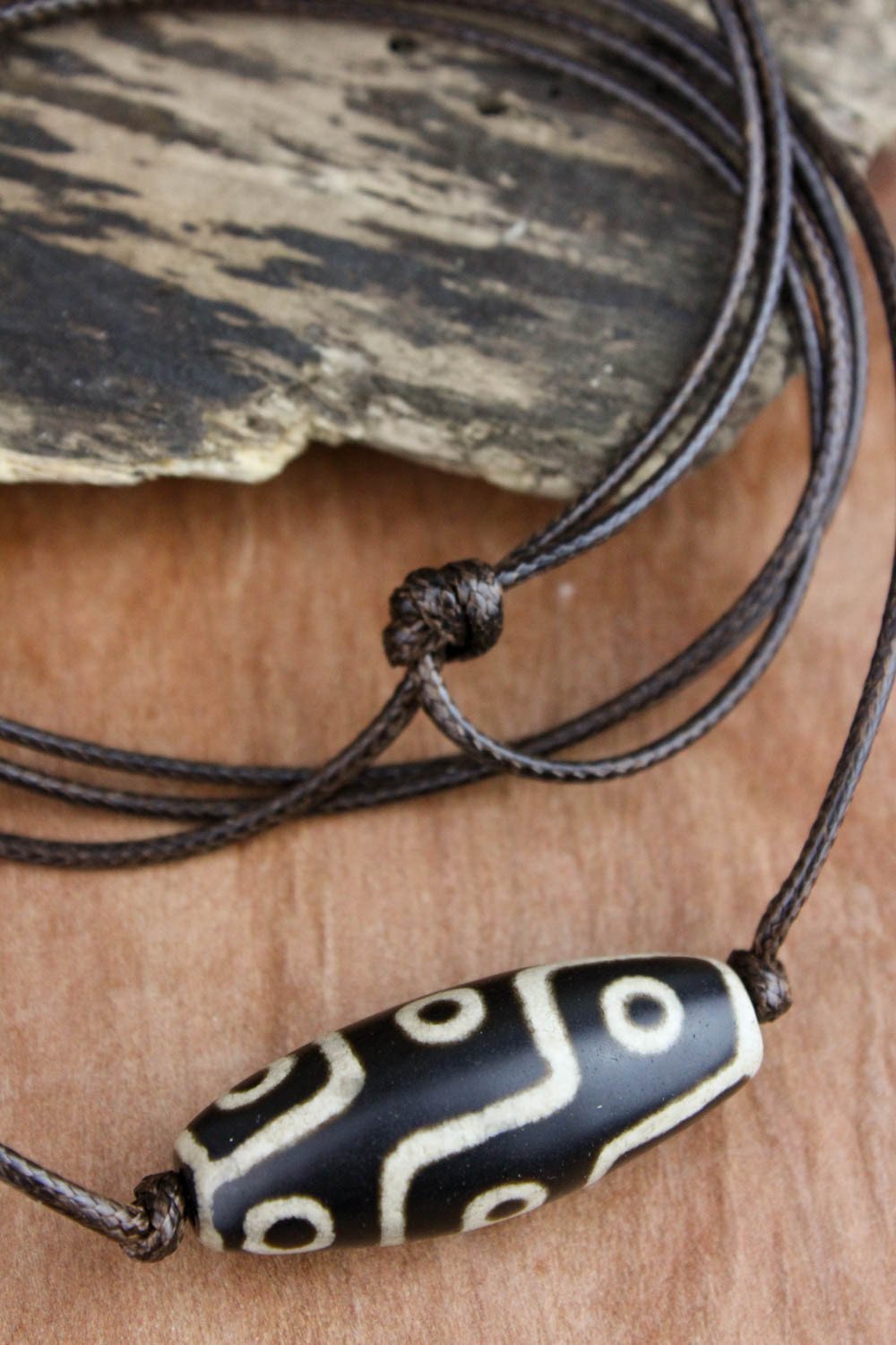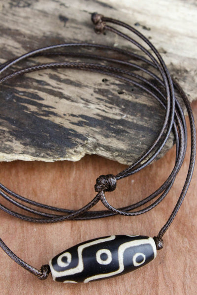 Cuenta Dzi de 9 ojos de ágata verdadera colgada en cordón de cuero vegano marrón. Ajustable. Cuenta de aproximadamente 1 1/2 pulgada de largo. El cable mide relativamente 42 pulgadas de diámetro.