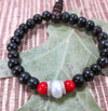 Mide aproximadamente 6 1/2 pulgadas de diámetro. Confeccionado con un cordón elástico para adaptarse a la mayoría de las muñecas. Contiene 26 cuentas de 8 mm, con un espaciador de nácar de aproximadamente 8 mm. Hecho a mano.
