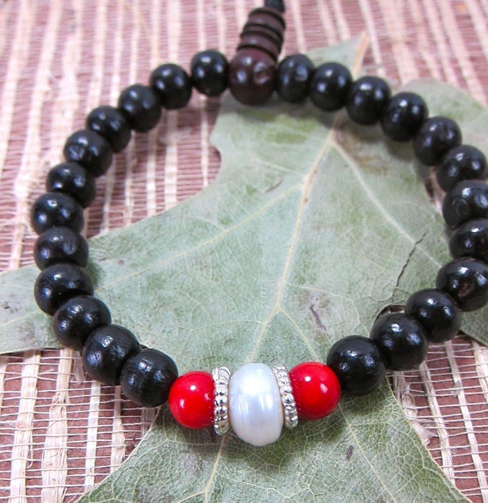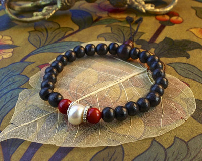 Mala de muñeca de palisandro muy sencilla y moderna con una madreperla y dos espaciadores de coral.