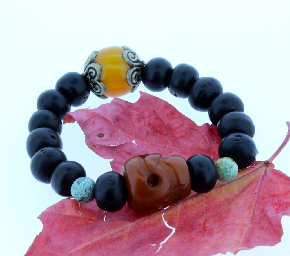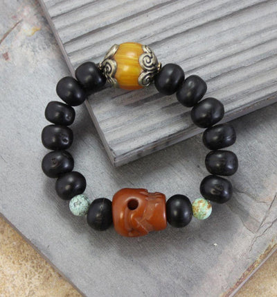 Solo nos quedan unas pocas hebras de estas viejas semillas de bodhi de 11 mm, las ensartamos con una calavera de copal y un colgante tibetano con tapa de plata y 2 cuentas de turquesa africana.