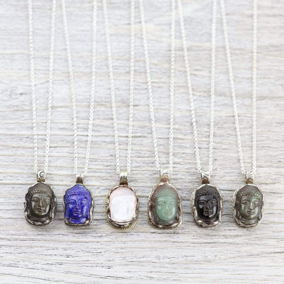 Tenemos 6 collares de Buda con piedras preciosas para elegir: obsidiana, lapislázuli, cristal, aventurina, ónix y labradorita.