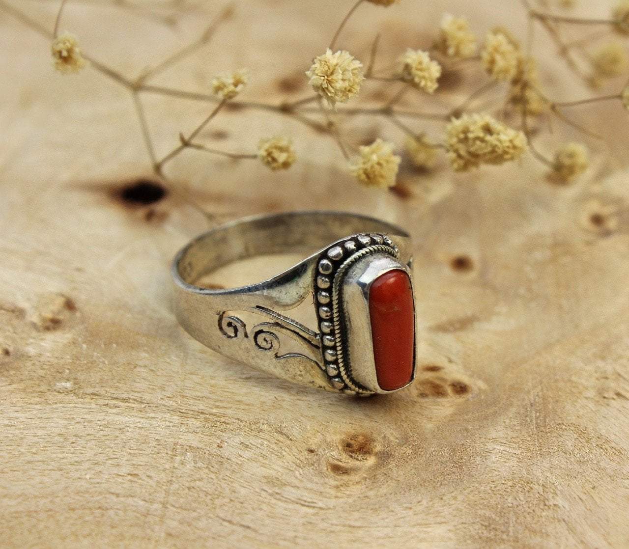 Coral sherpa engastado en plata de primera ley con un pequeño diseño recortado en la banda.