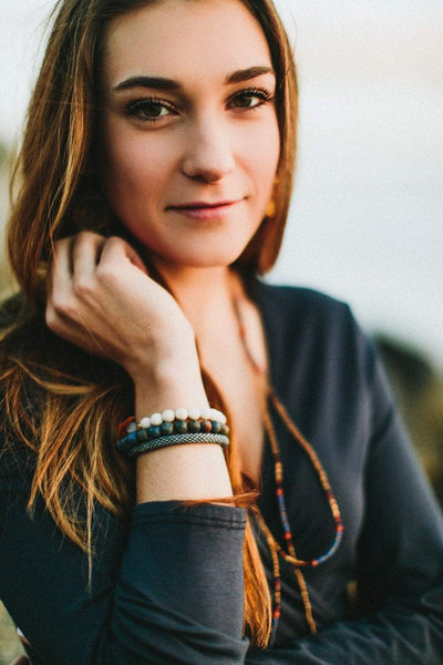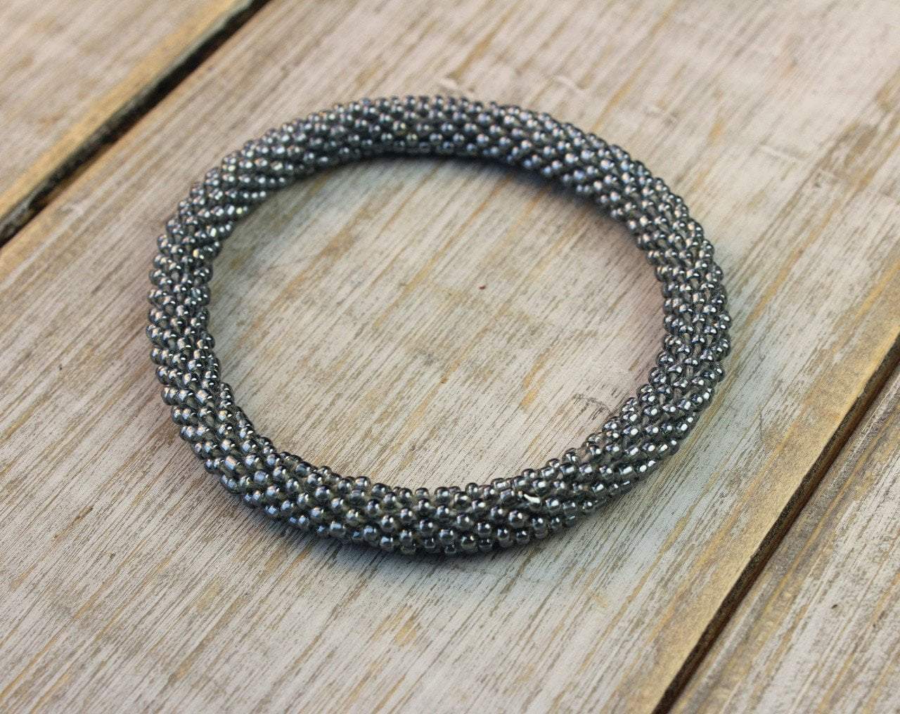 Un grupo caritativo de mujeres artesanas de Nepal tejió cuidadosamente a mano estas pulseras de comercio justo. Fabricada con cuentas checas y japonesas de la mejor calidad, la pulsera se estira al pasar sobre la muñeca.