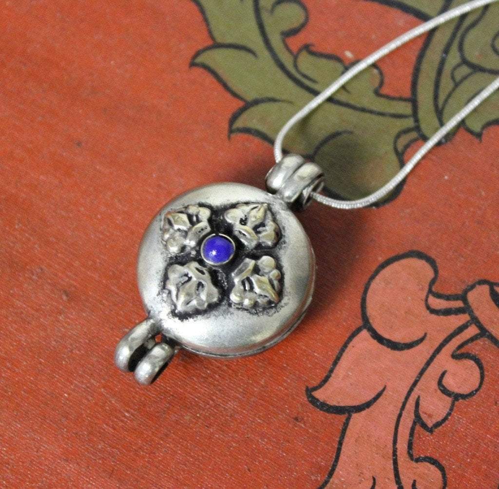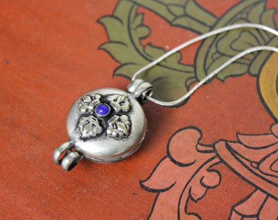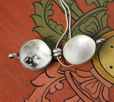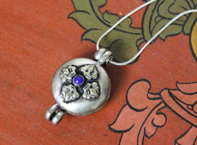 Un amuleto gau de estilo tradicional Dorje, en su interior hay un pequeño fragmento de un pañuelo de oración y una imagen de SS el Dalai Lama.