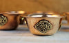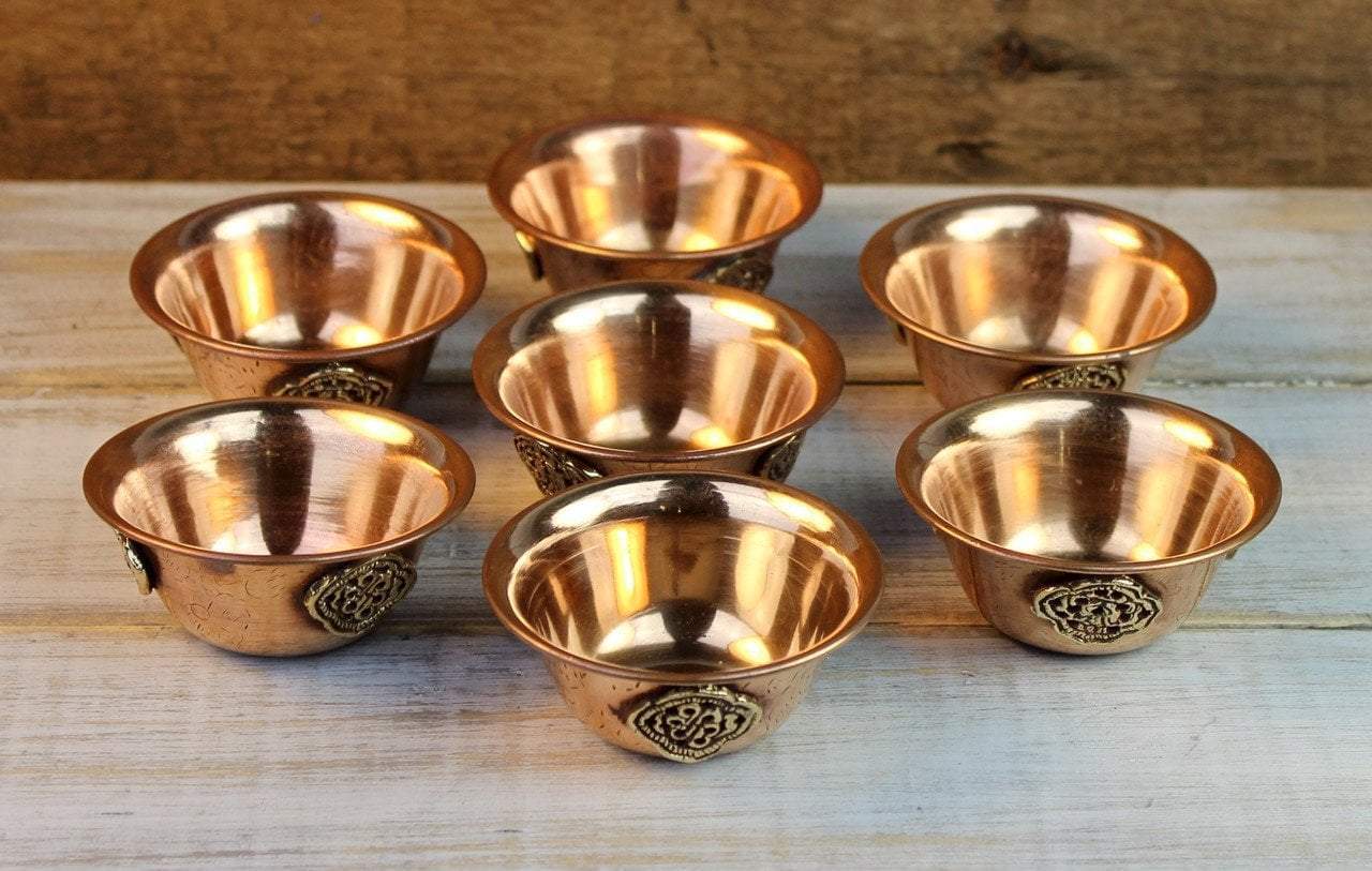Un hermoso juego de siete cuencos de ofrendas de cobre. Se puede colocar un juego de siete cuencos de ofrendas en el santuario y llenarlos con agua diariamente como una forma de acumular virtud y mérito. Hecho a mano en Nepal.