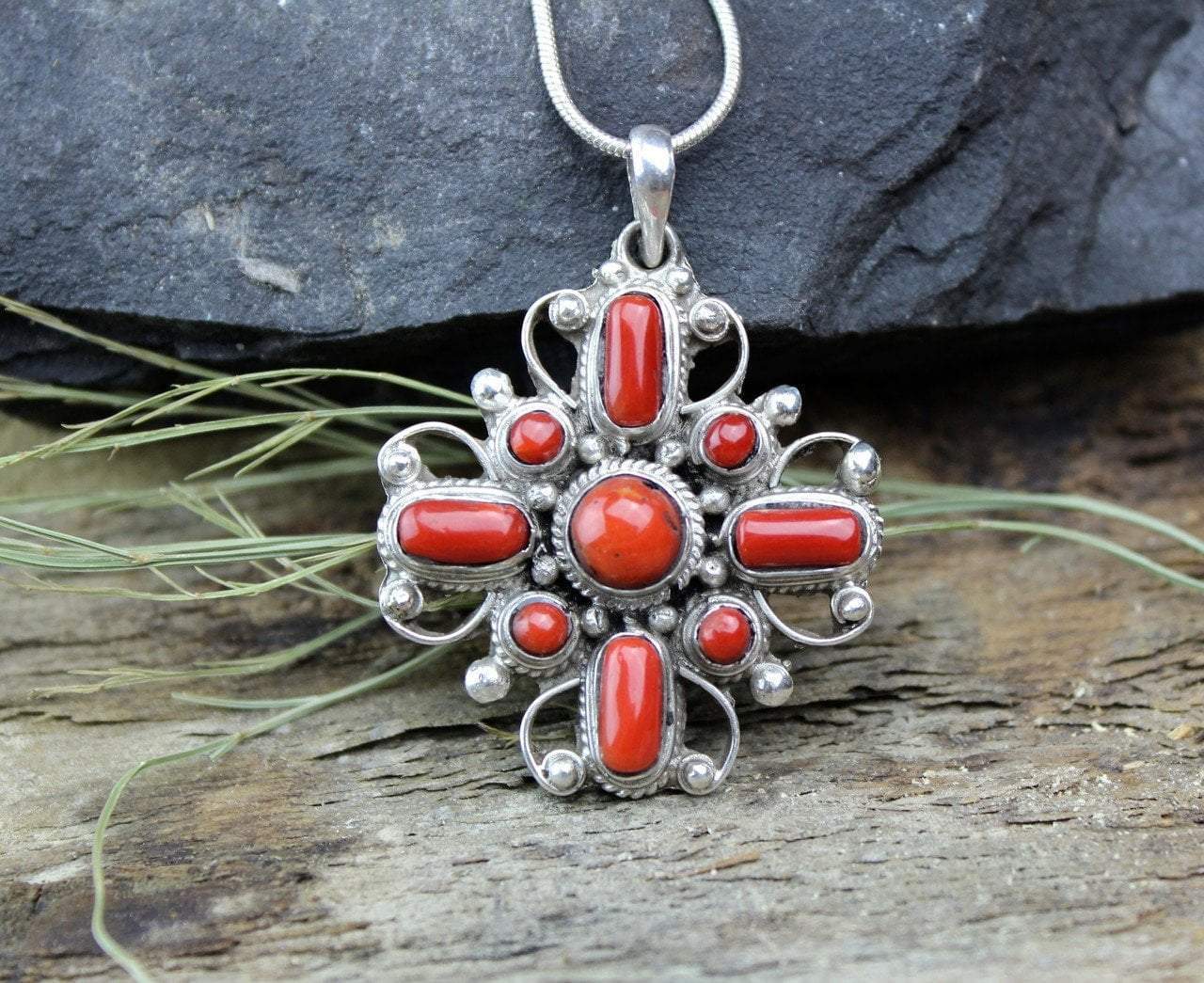 Coral de alta calidad con colgante tradicional de plata tibetana de plata de primera ley. Hecho a mano en Patan, Nepal. Mide aproximadamente 1,25-1,5 pulgadas.