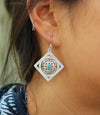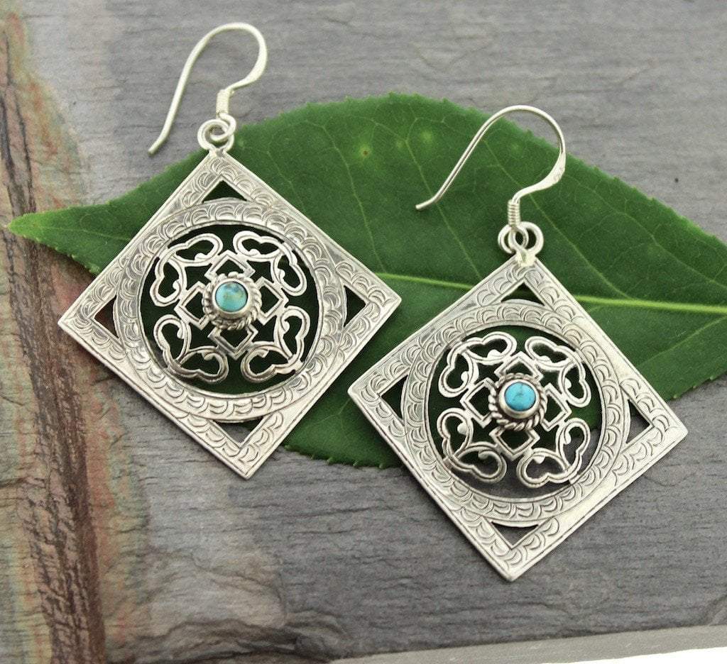Estos pendientes, un nuevo y fascinante diseño, están hechos a mano por artesanos de quinta generación en Katmandú, Nepal. Pendientes de mandala de plata de ley exquisitamente únicos con incrustaciones de una piedra turquesa.