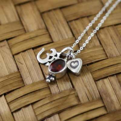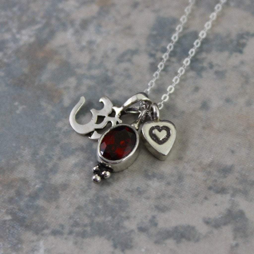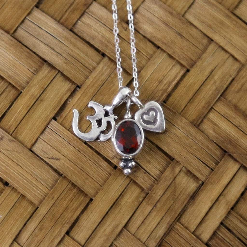 Tenemos 12 de estos collares de plata esterlina hechos a mano para el día de San Valentín. Granate, OM y corazón en plata de primera ley.