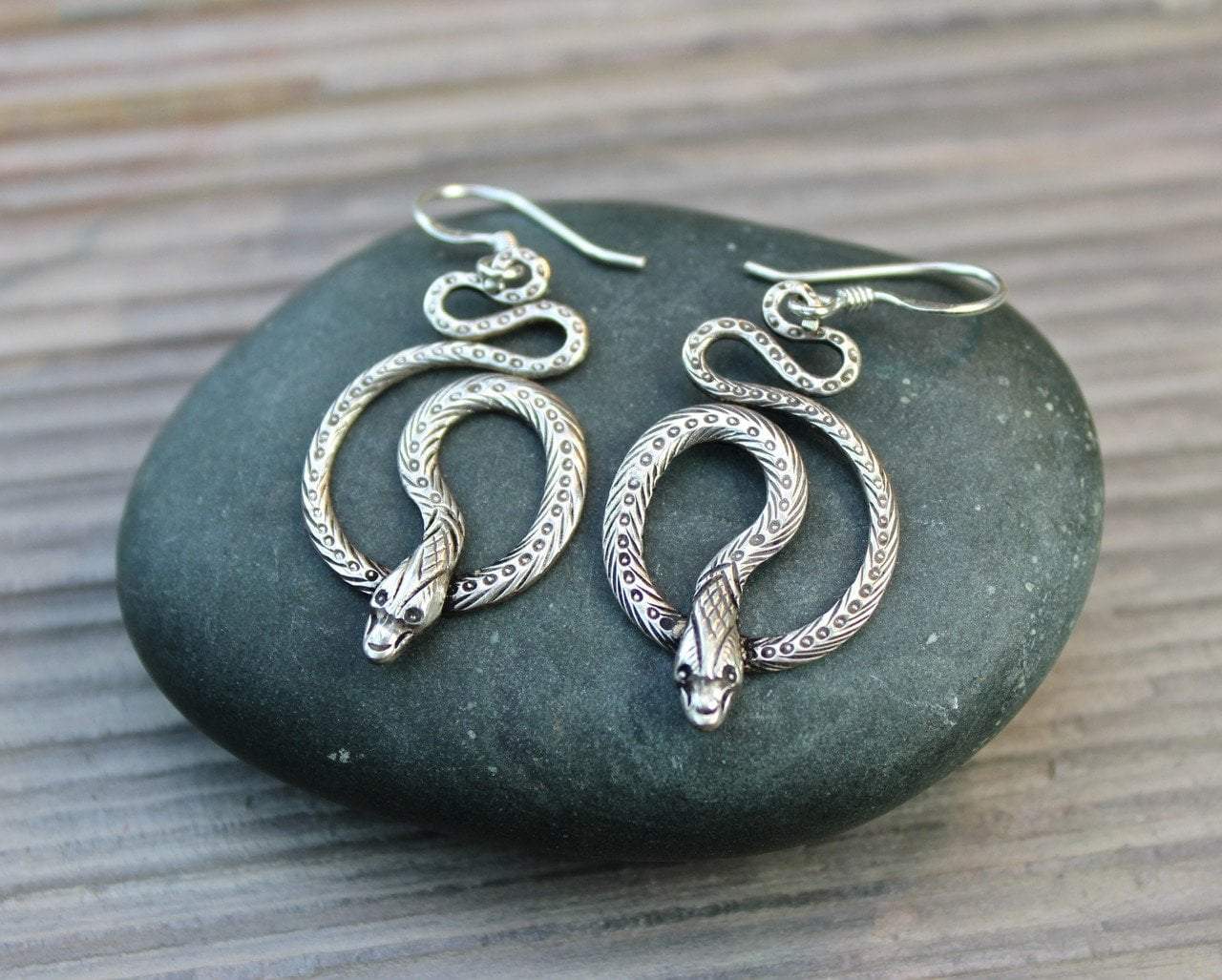 Pendientes de serpiente de plata de primera ley que cuelgan de ganchos franceses de plata de primera ley. Hecho a mano con extremo detalle en Nepal.