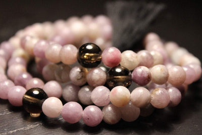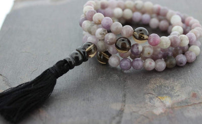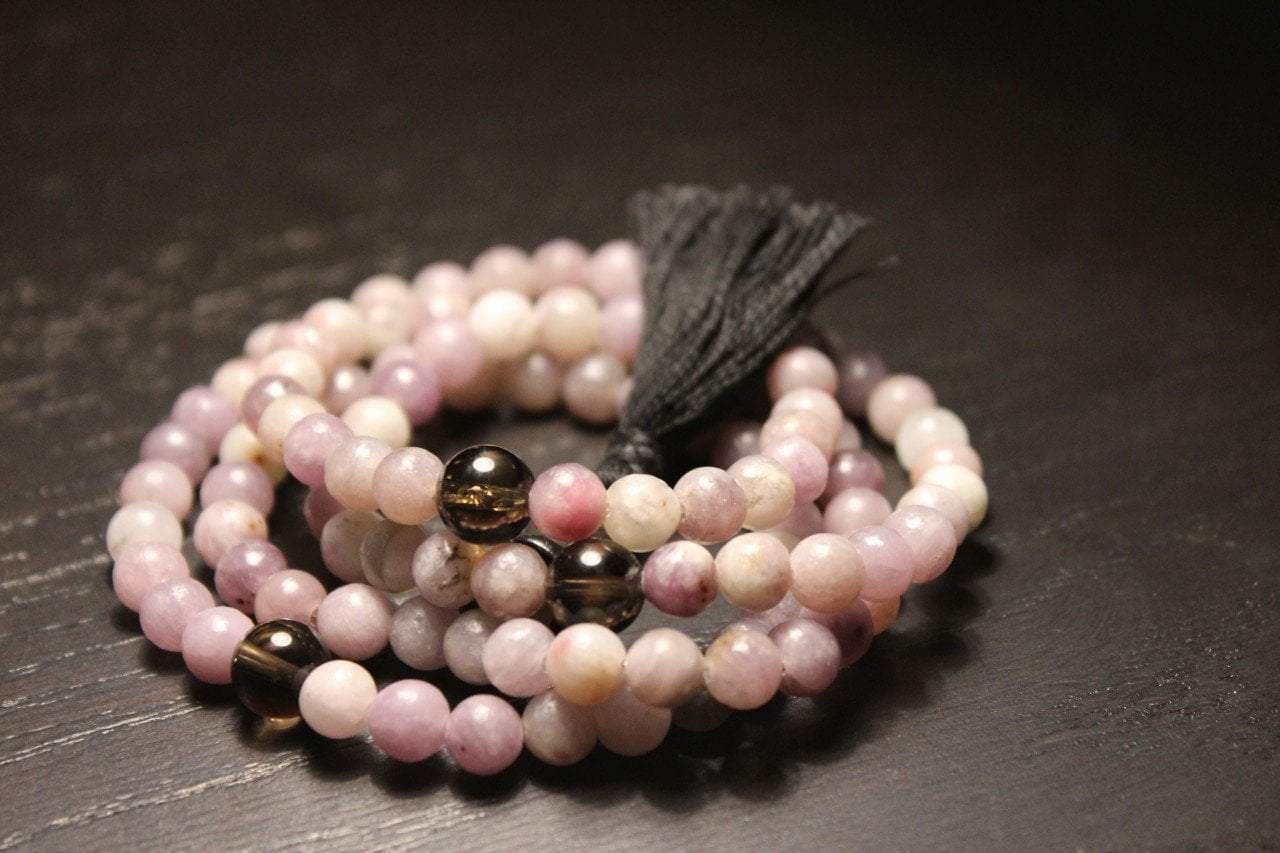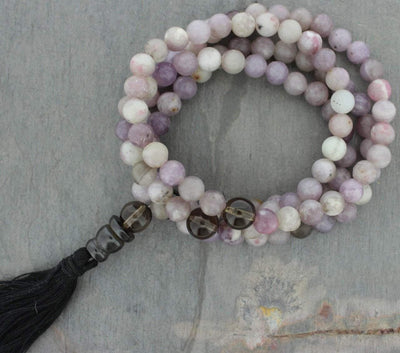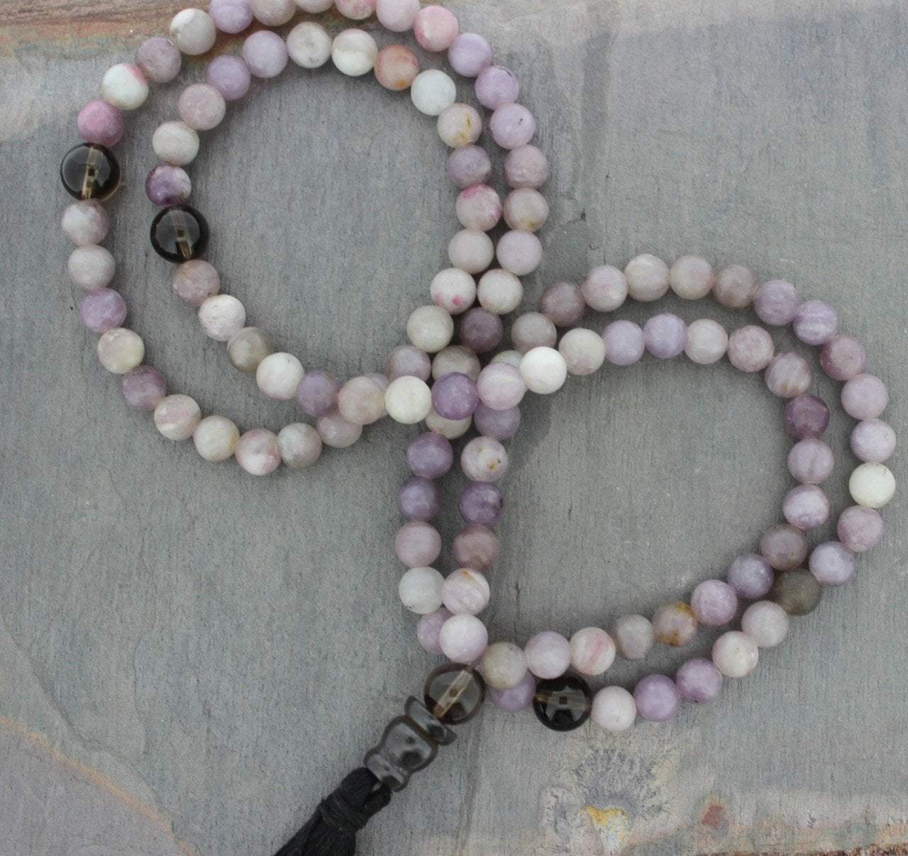 ¡Nuestras 108 malas elásticas son un gran éxito! 108 piedras de cuarzo color lila de 6 mm con acabado satinado espaciadas con hermosas cuentas translúcidas de cuarzo ahumado de 8 mm y piedra gurú. La cuenta de hueso remata una borla de cordón de algodón negro. Estas piedras lilas tienen el color terroso suave y perfecto para una meditación calmante. Cuando miras de cerca, puedes ver rosas, tostados, blancos, morados intensos e incluso algo de naranja atardecer. Esta es una de mis cuentas nuevas favoritas en DharmaShop, ¡y tiene un tamaño perfecto para usar o usar con mantras!