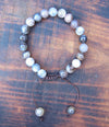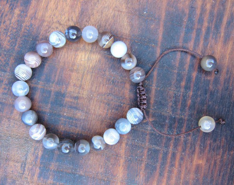 21 hermosas ágatas ensartadas en un cordón marrón oscuro que luego se anuda a mano y se remata con cuentas en los extremos. Hecho a mano por artesanos tibetanos en Estados Unidos. Tamaño: 21 cuentas de 8 mm. Totalmente ajustable.