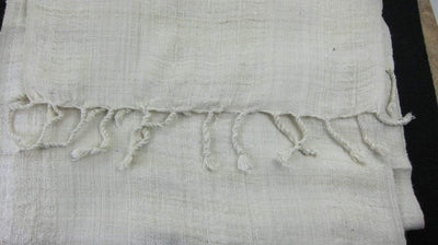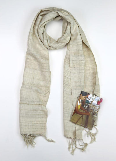 Este elegante pañuelo de seda, extremadamente suave, tejido a mano proviene de una cooperativa artesanal de Assam que emplea a tejedoras indígenas Bodo. Esta seda se conoce como ahimsa o seda de la paz. Los capullos de gusanos de seda se recolectan sólo después de que han surgido las polillas, a diferencia de la producción de la mayoría de las sedas comerciales. Esto da como resultado un mayor grado de pureza de la fibra, enfatizando el brillo natural de la seda. La tela de seda se teje en telares con estructura de zidagar. Estos telares están elaborados con bambú y otros materiales disponibles localmente. El artesano ensarta cuidadosamente los hilos verticalmente sobre el telar. Luego teje hilos entrelazados horizontales en patrones decorativos.