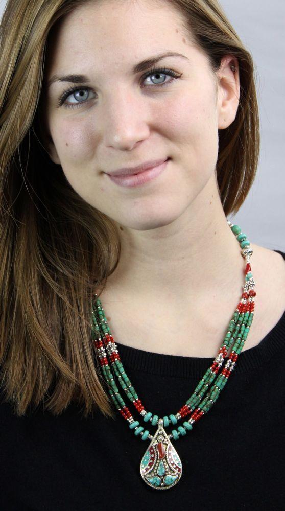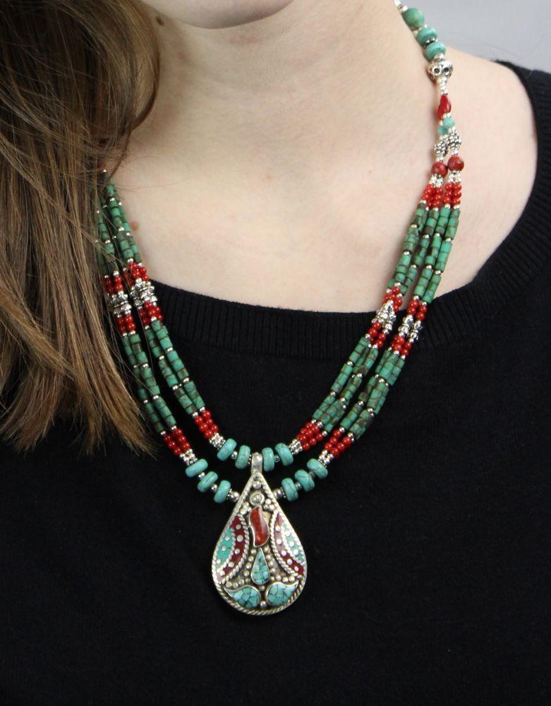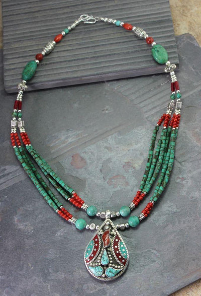 Este clásico collar tibetano presenta seis hebras de cuentas de turquesa Heishi que conectan espaciadores tibetanos tradicionales. Acabado con un colgante principal tibetano de coral y turquesa.