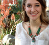 Mide aproximadamente 18 pulgadas alrededor. El colgante mide 2 pulgadas de alto y está adornado en plata. Fabricado en Nepal.
