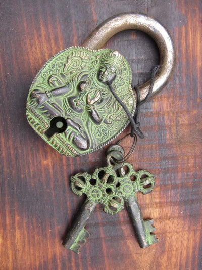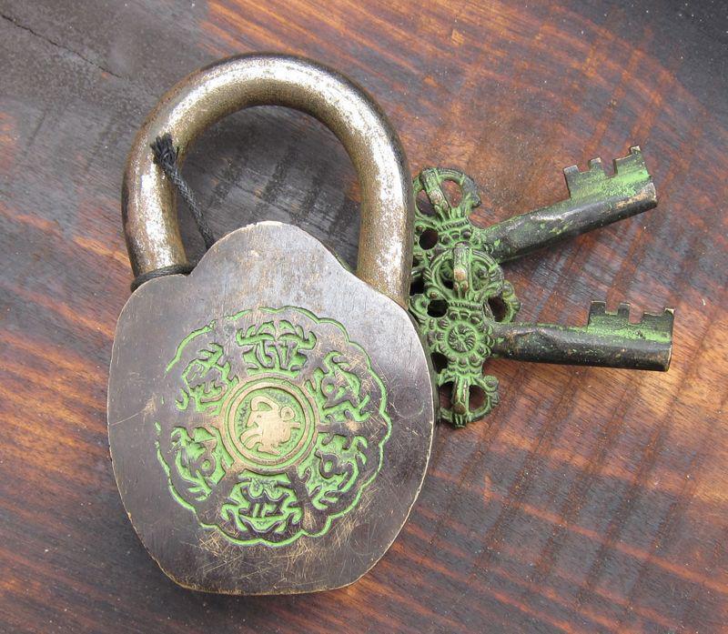 Estos increíbles candados fueron elegidos a mano en tiendas alrededor de la estupa boudhanath el pasado mes de febrero. Cada cerradura realmente funciona, se usan ampliamente en todo el país y las vimos manteniendo las puertas cerradas con llave en monasterios y hogares en todo Nepal. Tamaño: 4 pulgadas de alto