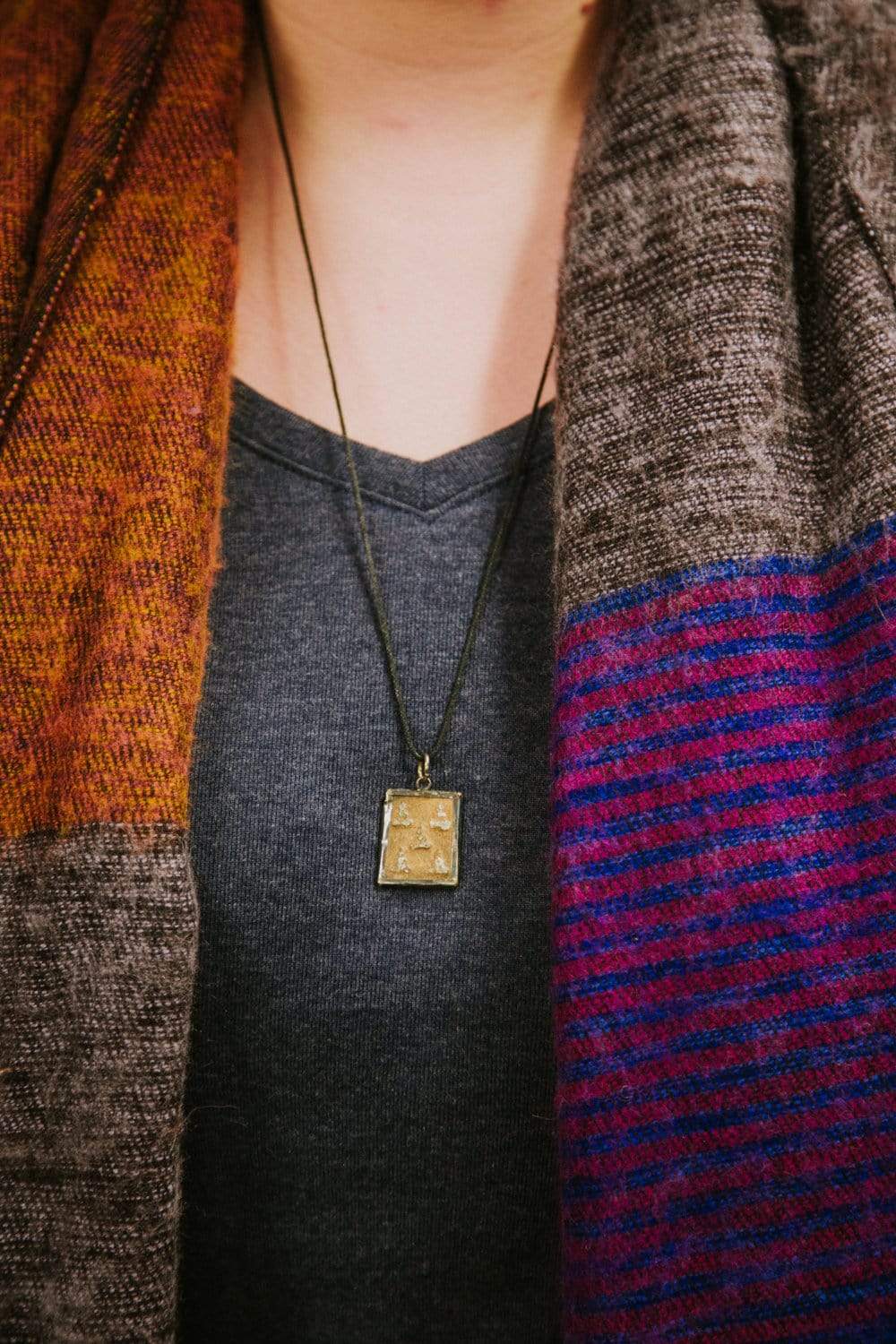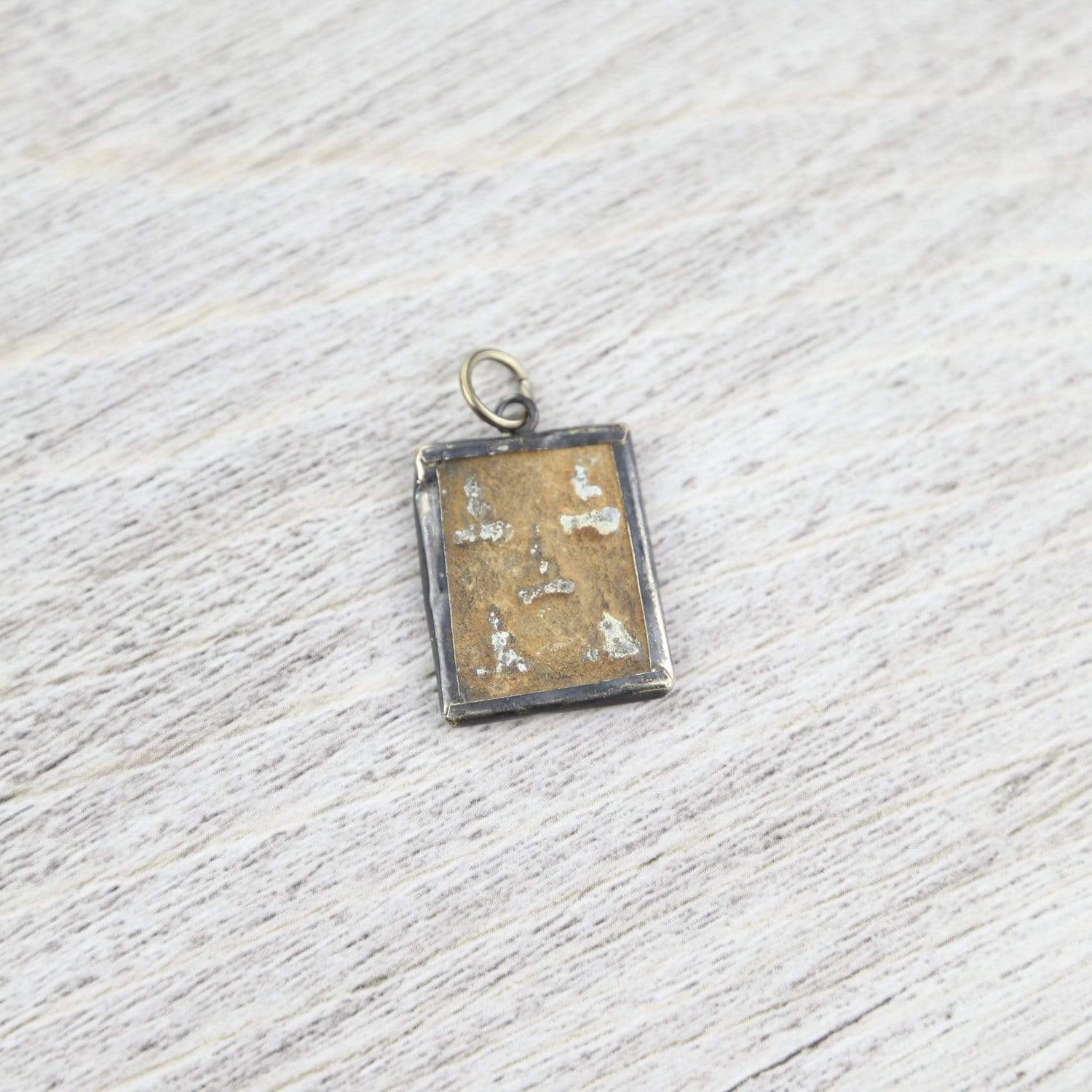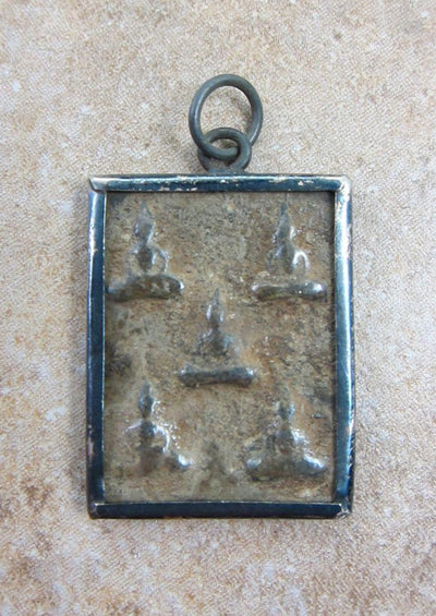 Los Cinco Budas Dhyani, también conocidos como los Cinco Grandes Budas, son representaciones de las cinco cualidades de Buda. Se cree que cada Buda es capaz de superar un mal particular con un bien particular. El reverso incluye un símbolo tailandés grabado a mano que representa un templo. Los monjes budistas moldean a mano cada uno de estos amuletos de cerámica antes de colocarlos en el marco de metal.