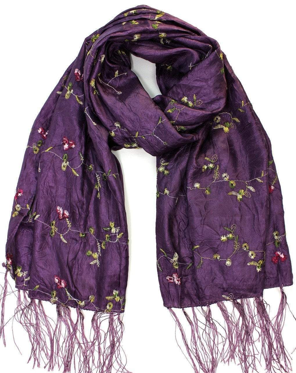 La bufanda ligera perfecta para finales de verano y principios de otoño. Perfectamente de color ciruela con flores bordadas en verde y rosa. Pañuelo 100% seda procedente de Tailandia.