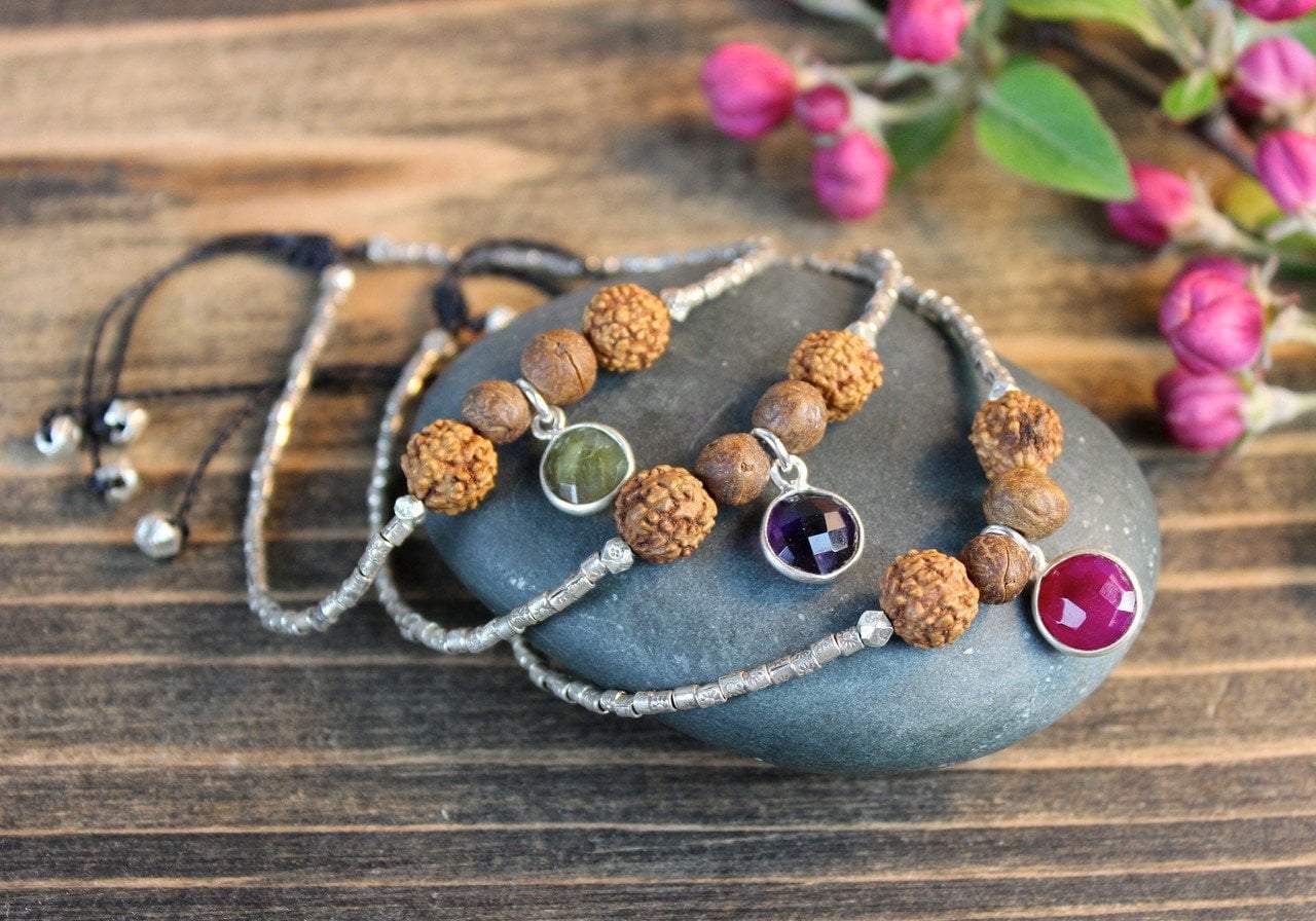Tamaño: Cuando están abiertas, las tres pulseras miden aproximadamente 6 pulgadas. Cuando están cerradas, las tres pulseras miden aproximadamente 4 pulgadas. Las piedras preciosas miden aproximadamente 10 mm, las cuentas de palo de rosa miden aproximadamente 6 mm y las cuentas de rudraksha miden aproximadamente 8 mm.