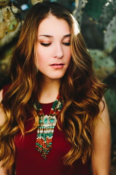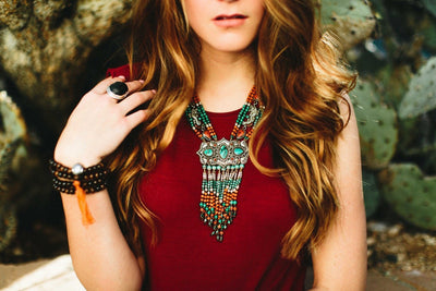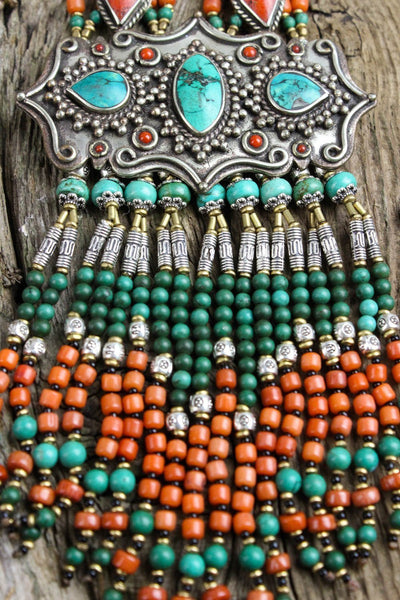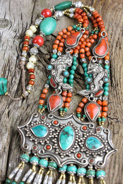 Este collar es una de las inspiraciones para nuestra próxima colección de primavera. Trabajamos con nuestros artistas en Nepal para crear una variedad de piezas impresionantes y originales que habitan el espíritu del Tíbet. Utilizando elementos antiguos y modernos, este collar es una pieza llamativa y colorida que nunca pasará de moda. Usadas con ropa formal o una camisa vaquera informal, las joyas tibetanas parecen casi del sudoeste para nuestra sensibilidad, ya que la estética del diseño es muy similar. El collar presenta cuentas de coral y turquesa en cascada hacia y desde un colgante tibetano de plata con piezas de turquesa y coral.