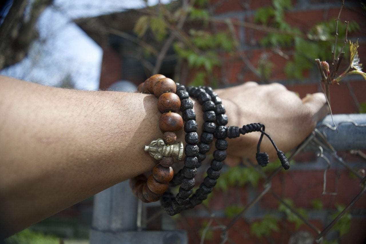 Esta muñeca mala ajustable mide 8 pulgadas cuando está cerrada. Puede adaptarse a muñecas más grandes. Incluye semillas de bodhi de 12 mm, un dije de campana tibetana de peltre y cuentas de rudraksha de 7 mm. Hecho a mano en Nepal.