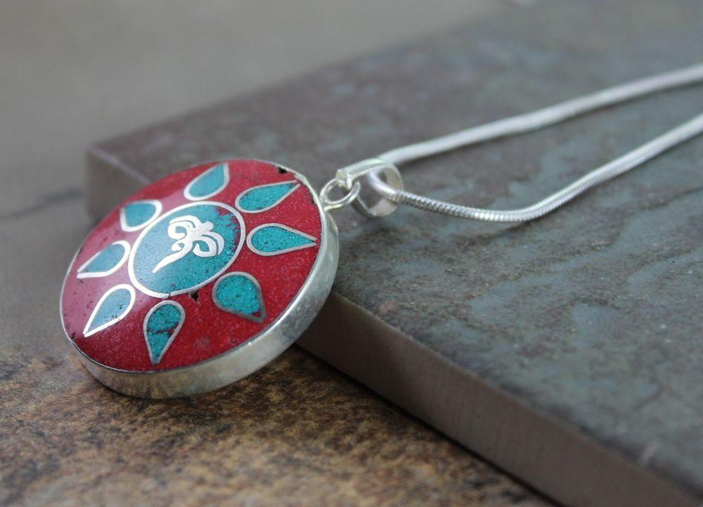 Colgante de coral con ojos de Buda y puesta de sol tibetano en metal blanco con incrustaciones de coral y turquesa.
