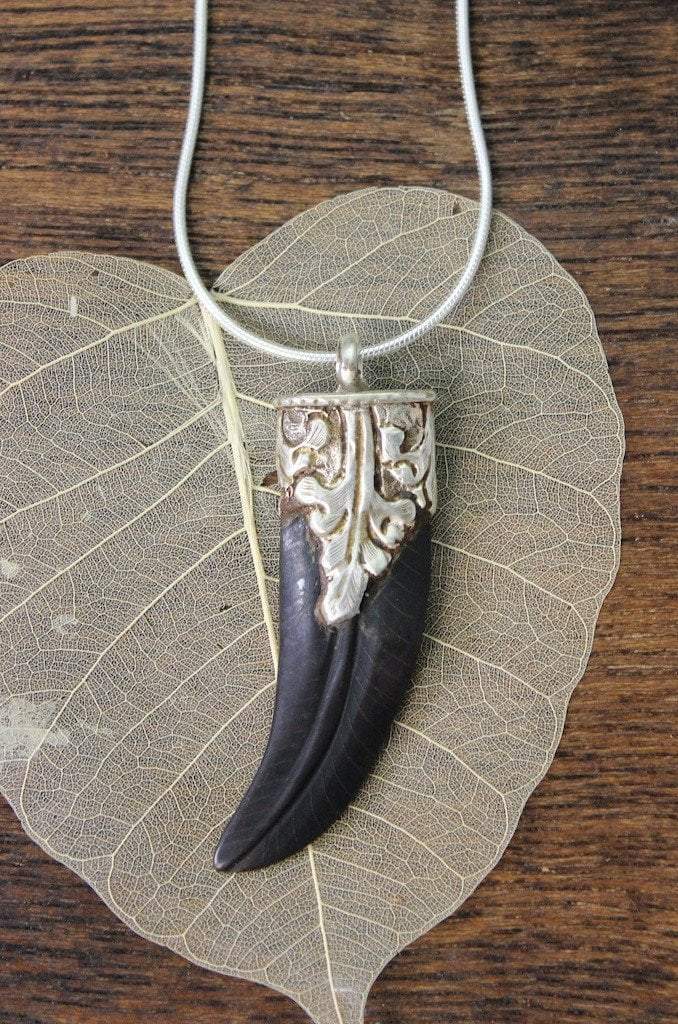 Los colgantes estilo cuerno tibetano son muy populares en este momento, aparecen en las portadas de revistas de moda en todos los tamaños y estilos. Este colgante en forma de cuerno está hecho de cuerno de búfalo con incrustaciones de plata.