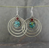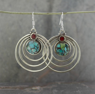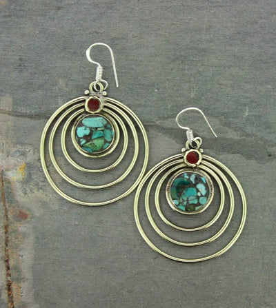 ¡Estos pendientes de estilo tradicional tibetano tienen un toque moderno! Presentan un diseño radial en espiral con hermosas incrustaciones de turquesa y coral. Hecho a mano por nuestro destacado artesano tibetano, Qazi. Los pendientes están bañados en plata con ganchos franceses de plata de primera ley.