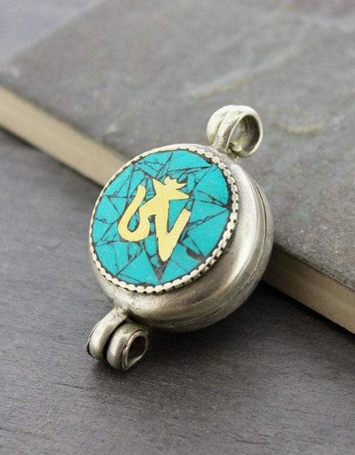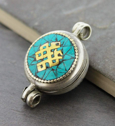 Uno de mis favoritos de mi reciente viaje de compras a Nepal. Este gau grande tiene dos caras con diseños de OM y nudos eternos espectacularmente detallados con incrustaciones de chips de turquesa y detalles dorados.