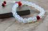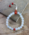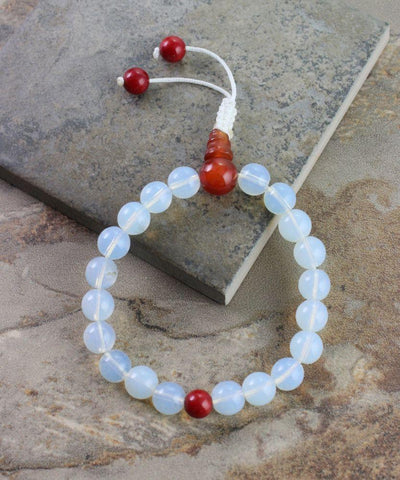 La opalita tibetana es una piedra etérea, ligeramente turbia y de tinte casi azulado. Una hermosa y sencilla mala con espaciador de coral y cuenta de gurú de cornalina.