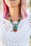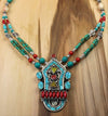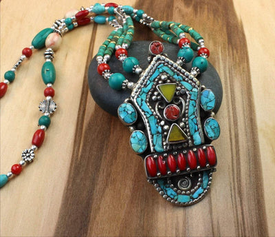 Un diseño tradicional tibetano con toques coloridos. Cuentas de coral, ámbar, turquesa y plata están ensartadas con un gran colgante plateado con incrustaciones de una variedad de piedras. Hecho a mano en Nepal.